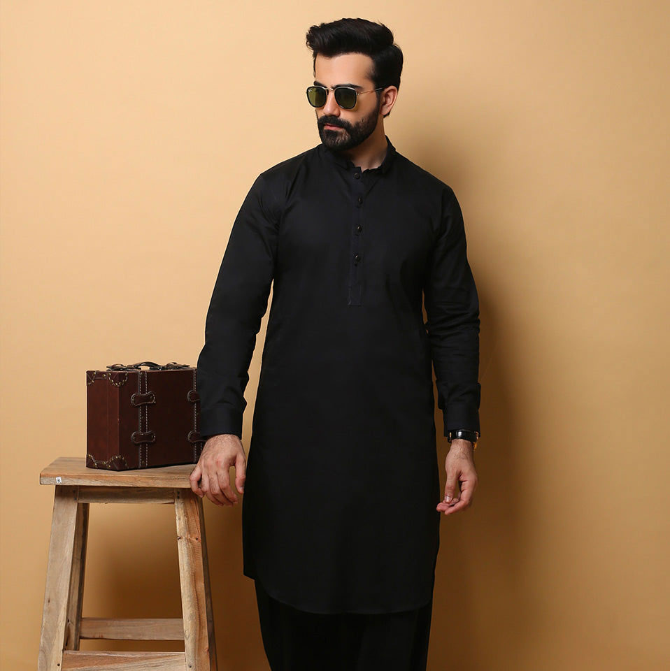 🔹 Color: Black🔹 Fabric: Premium Blended Wash & Wear Boski🔹 Finish: Soft feel, subtle sheen, wrinkle-resistant🔹 Type: Unstitched – Easy to tailor to your fit🔹 Season: All-season comfort Make a bold and timeless statement with...